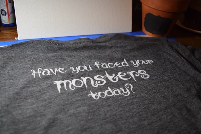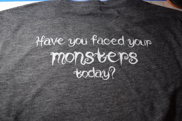 This soft, comfortable tee sports the shop logo that many have grown to love! This tee has a distorted and vinage look to the logo, as well as sporting the quiote "Have you faced your monsters today?" on the back!